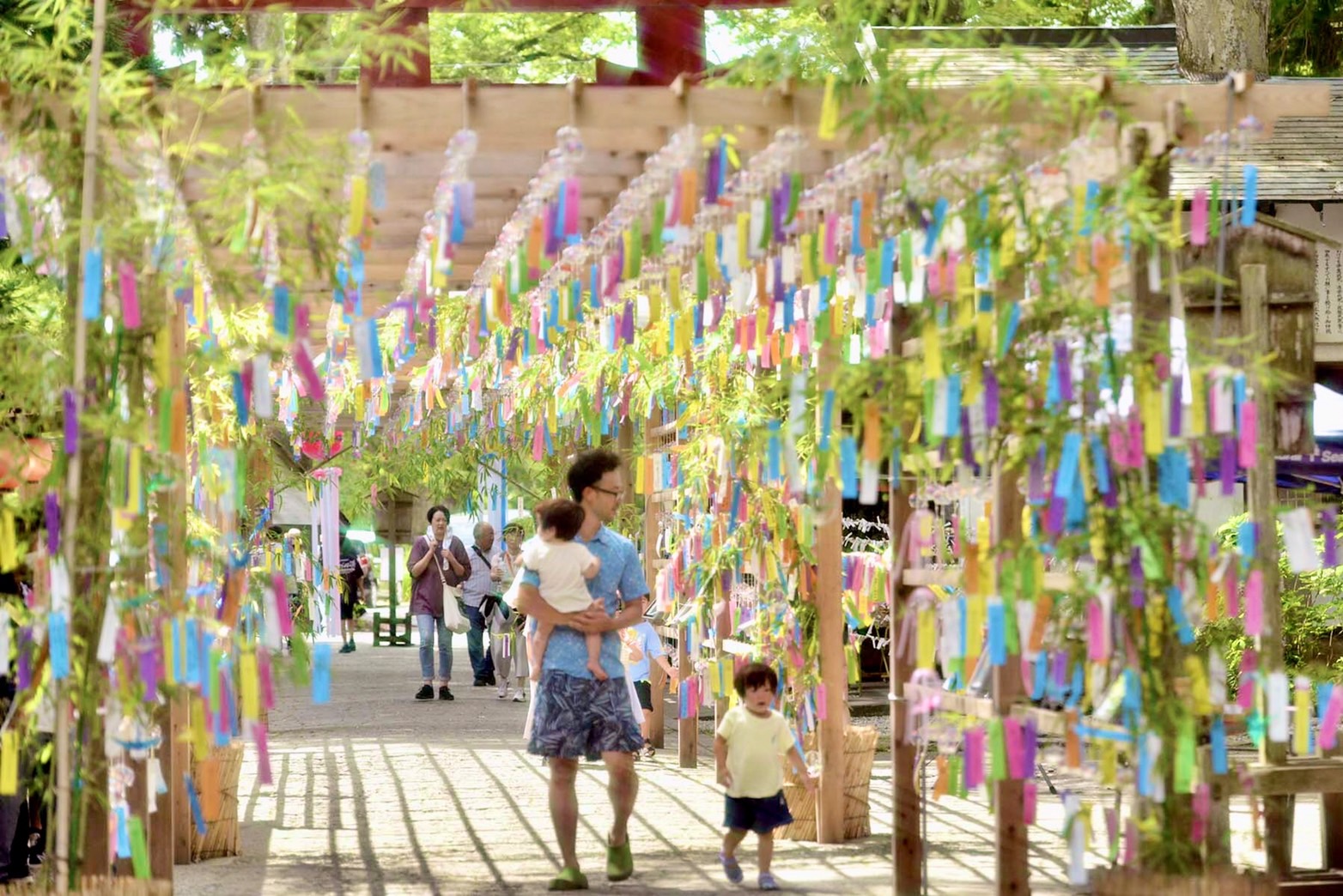 内苑や表参道に設置された風鈴廊に約3,500個の風鈴が飾られ、夕刻からは七色にライトアップされて非日常的な空間となります。また、いたるところに設置された笹竹には、参拝者が思い思いに書き記した色とりどりの短冊で彩られ、境内では、地元の伝統工芸や作家さんが作製した風鈴の授与(販売)もされます。8月7日に行われる乞巧奠では、装束を着けた歌人らによる和歌披講をはじめ、地元の高校生や小学生たちが舞う巫女舞や太々神楽などが奉納されます。