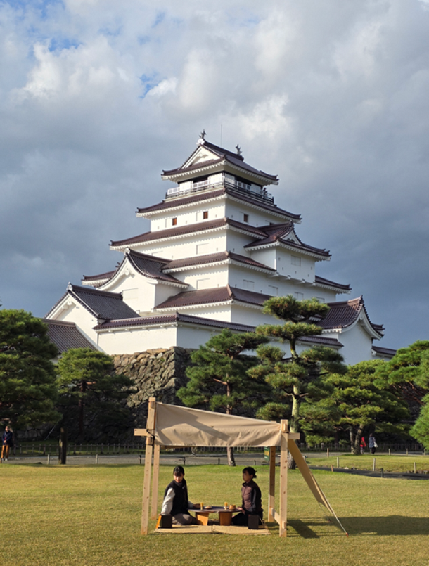 千家茶道再興の地である鶴ヶ城公園内に「野外茶室」を設置し、敷居が高い「お茶」のイメージを払拭し、誰でも気軽に自分のペースで自由な野点を体験できるコンテンツです。茶道は、流儀や作法があり、身近に捉えられていないという側面もあり利用者が限定されたことから、気軽に利用できるような雰囲気にします。