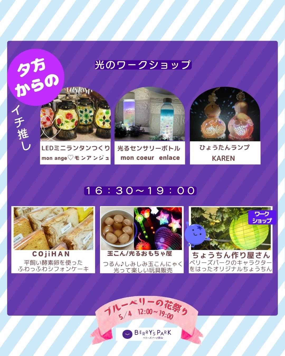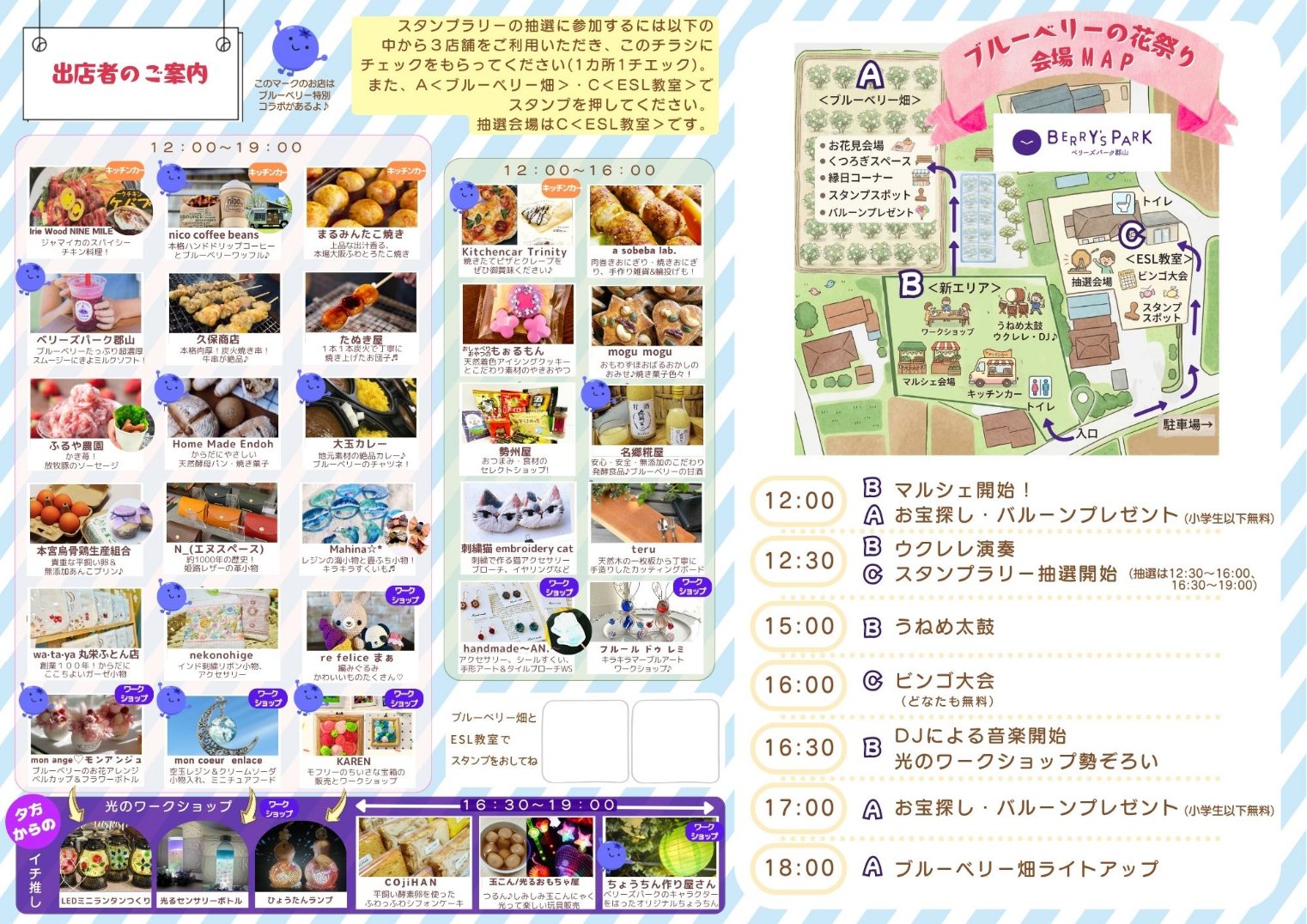 満開のブルーベリーの花の中で、ブルーベリーグルメや様々なアトラクションが楽しめる「ブルーベリーの花祭り」初開催!県内最大級のブルーベリー農園「ベリーズパーク郡山」では5月初め、2,000本108品種のブルーベリーが満開を迎えます。この日は農園を特別開放し、ブルーベリーの花を楽しみながらお買い回りやワークショップが楽しめるマルシェ、お宝探しやゲーム、音楽イベント、夜までわいわいブルーベリーの特別グルメを満喫できます。