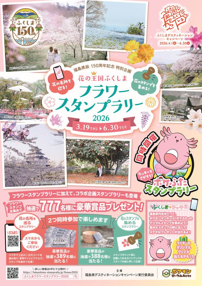 福島県の豊かな花の魅力を全国に発信するため、県内を周遊する「フラワースタンプラリーを開催します。今回は花の名所に加えて、ふくしま応援ポケモン・ラッキーが描かれたマンホール蓋「ポケふた」を巡る「ポケふたスタンプラリー」も同時開催。集めたスタンプの数に応じて、抽選で豪華賞品をプレゼント!