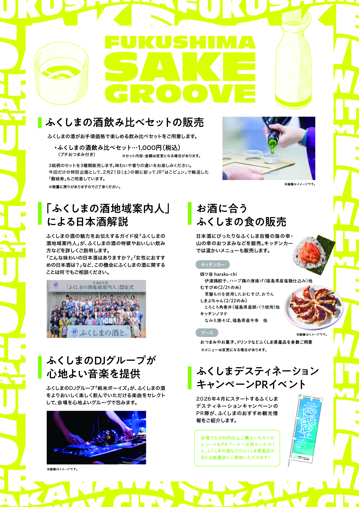 TAKANAWA GATEWAY CITYで、福島の日本酒の魅力に浸る特別な2日間。「FUKUSHIMA SAKE GROOVE ~音と酔うふくしまの酒~」では、心地よいDJサウンドとともに、選りすぐりの“ふくしまの酒”を気軽に楽しめます。試飲販売や県産食材のフード、HAPPYふくしま隊のPRなど、福島の魅力を五感で体感できるイベントです。