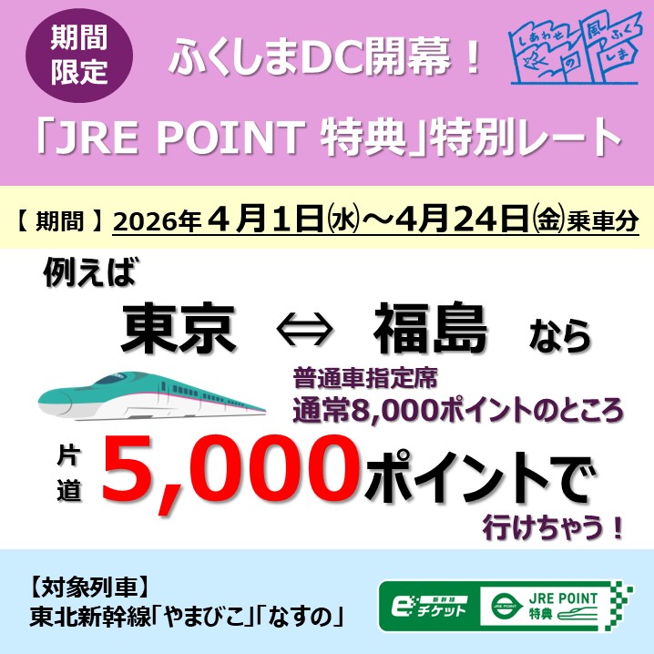 - (対象列車)東北新幹線「やまびこ」「なすの」普通車指定席(新幹線 e チケット/JRE POINT 特典)