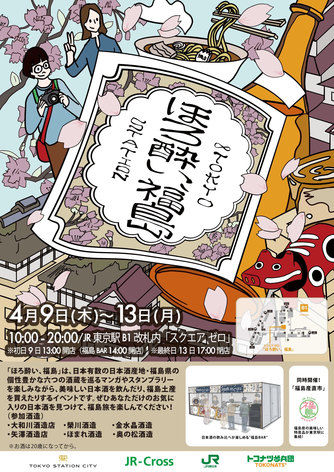 4月9日(木)〜13日(月)の5日間、「ふくしまデスティネーションキャンペーン」にあわせて、JR東京駅B1改札内「スクエア ゼロ」にて、福島の地酒と旅の魅力を五感で楽しむイベント『ほろ酔い、福島』を開催します!