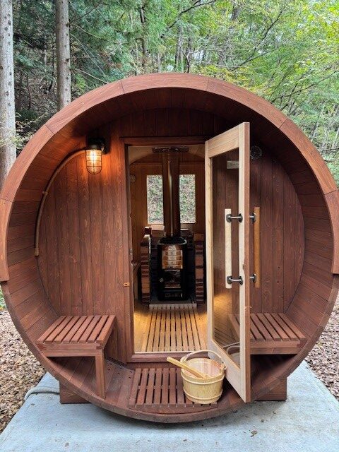 その1:森の中で子どもたちが森探検を楽しんでいる間、大人は自然のゆりかごに包まれながら、森のサウナでゆったりとととのう贅沢なひとときを過ごせます。(半額対象です)