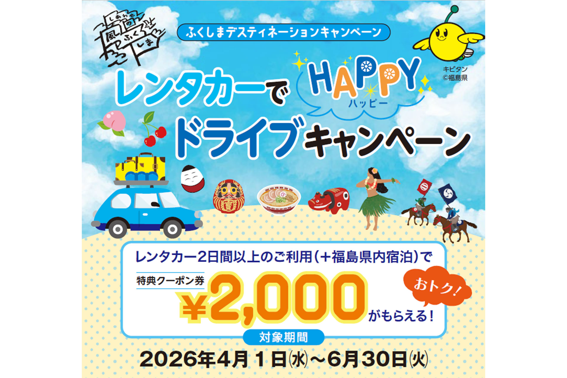 対象店舗でレンタカーを借りて、福島県内で宿泊旅行をする方に、県内のお土産などで使えるクーポン券をプレゼント。春の福島を自由に、おトクに楽しもう!