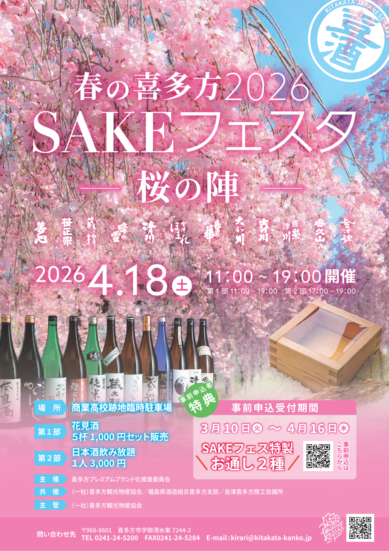 日中線しだれ桜並木の喜多方商業高校跡地臨時駐車場にて、「喜多方さくらまつり」開催期間中である4月18日(土)に、12蔵元の花見酒セットの販売や、飲み放題などを行います。夜は、ライトアップされた夜桜と日…