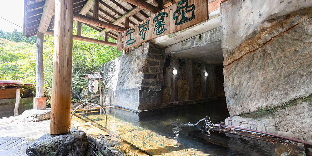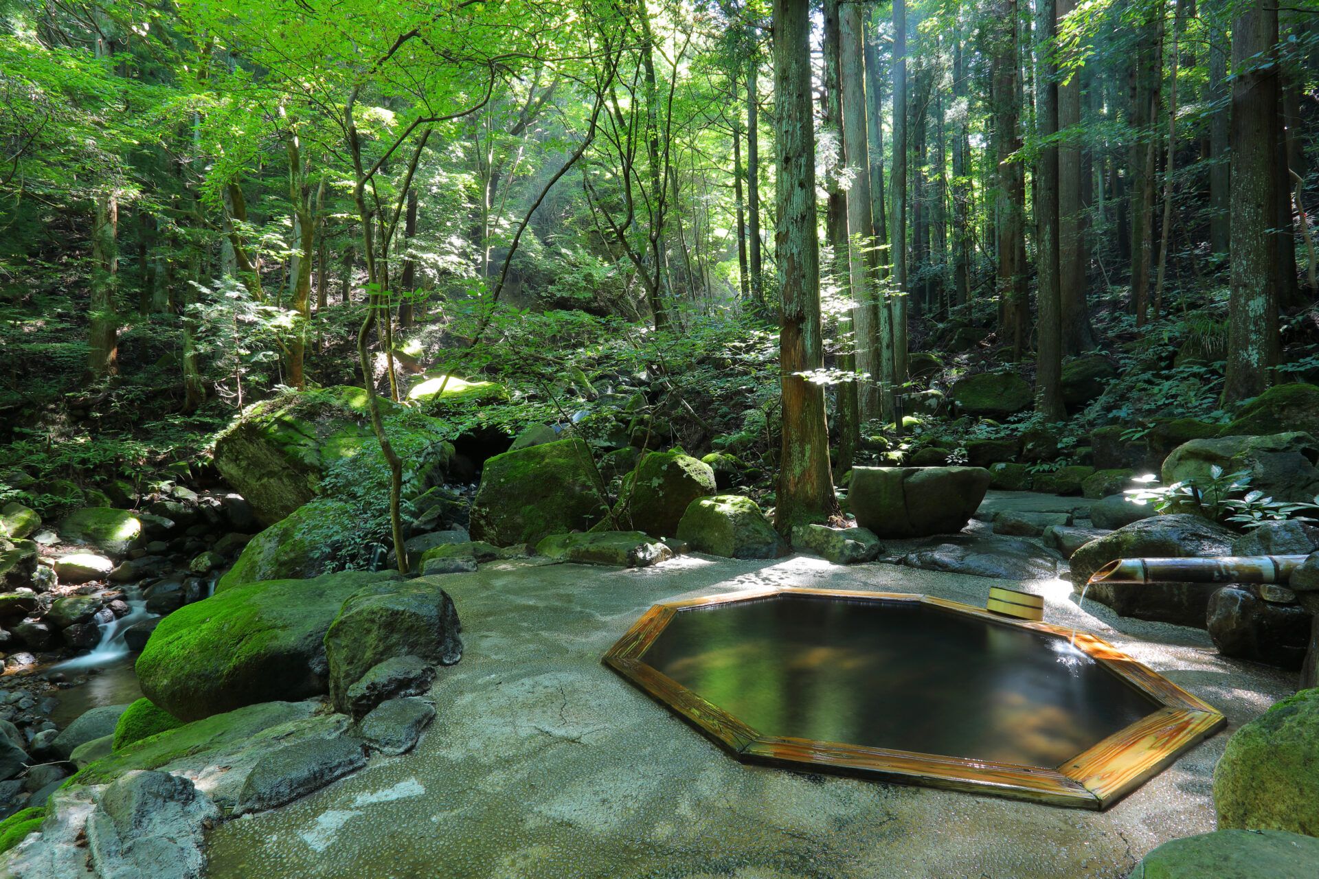 海抜1200メートルにある秘湯。源泉かけ流しで昔から胃腸、神経痛の名湯として知られております。鬼面山の山肌を眺めながら白い噴気と乳白色の温泉をお愉しみいただけます。