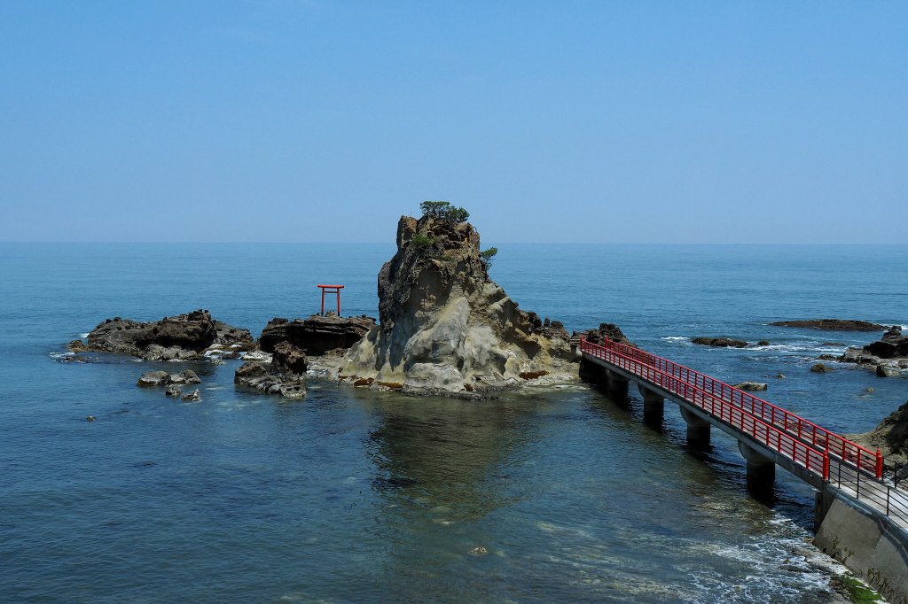 丸くて大きめの粒の砂利が特徴的な、美しい海岸です。目の前に弁天島と鳥居があり、海とのコントラストが美しく、絶景としても紹介されます。