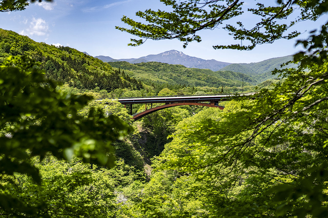 阿武隈川に架かる鉄橋。高さ約60mあり、紅葉の時期は渓谷全体や那須甲子連山の山々が紅く染まる。また、雪割公園駐車場より徒歩で行ける西の郷遊歩道では、一休みの滝や熊のすべり台など滝と紅葉のコラボレーショ…
