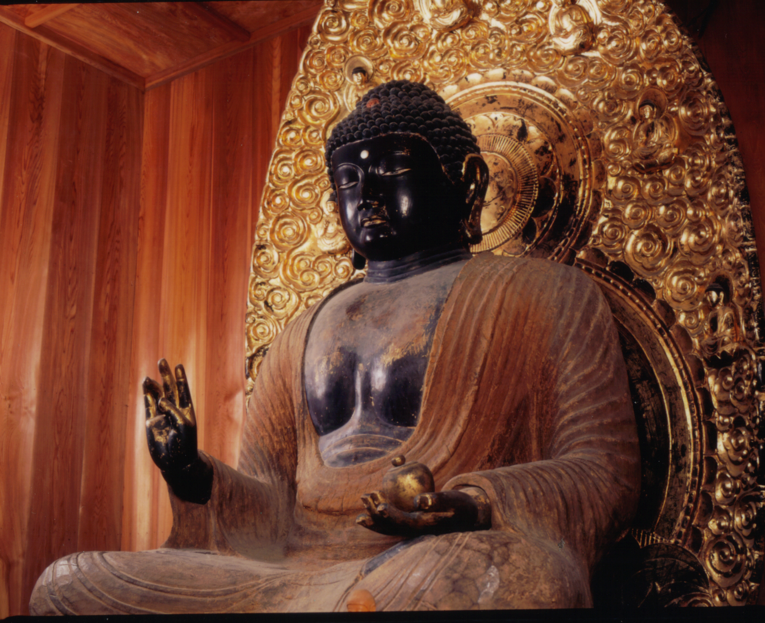 会津五薬師のひとつであり像高1.83 mの薬師如来坐像です。ケヤキの一木造で湯川村の国宝勝常寺薬師如来坐像の流れをくむものですが、荒々しく厳しい表情ではなく、優しく柔和な表情にかわっています。