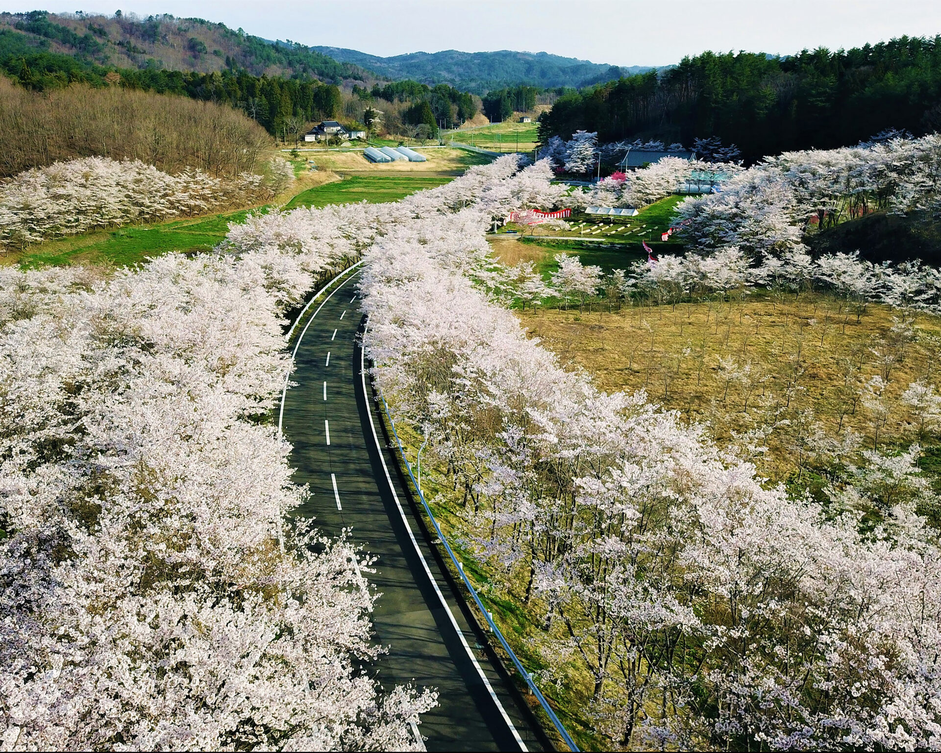 元養蚕農家のご夫婦が、震災前より植え続けたおよそ三千本の桜。里山に咲き誇る壮大な桜並木は圧巻。