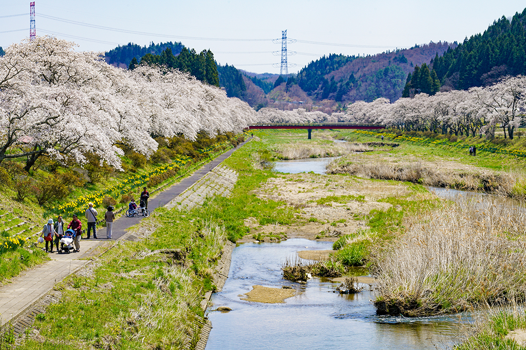 町中央を流れる北須川・今出川の河畔を染める「二千本の桜並木」や樹齢500年を超える県指定天然記念物の「高田桜」など、折々に表情を変える桜が咲き誇ります。折り重なる桜はソメイヨシノやエドヒガン、ベニシダ…